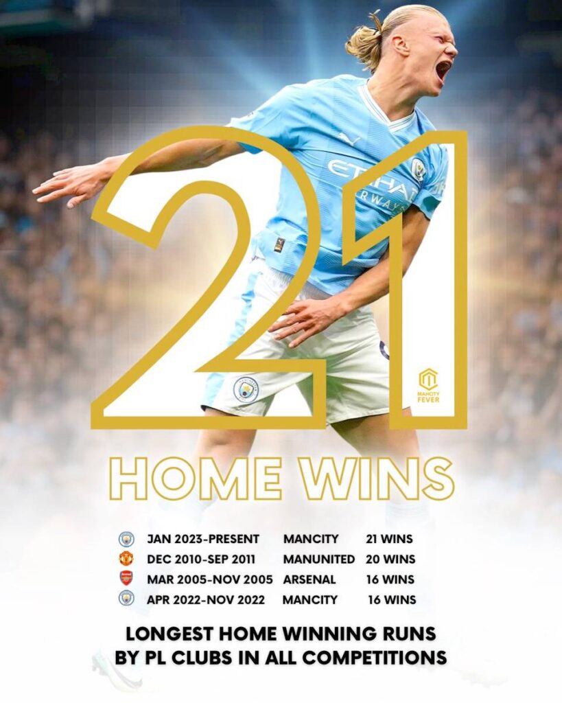 ဒီမှတ်တမ်းဟာ မြို့ခံပြိုင်ဘက် မန်ယူနိုက်တက်ကို ကျော်ဖြတ်နိုင်ခဲ့သလို ပရီးမီးယားလိဂ်သမိုင်းမှာ အကြာဆုံးသော အိမ်ကွင်း နိုင်ပွဲဆက် စံချိန် ဖြစ်လာပါတယ်။